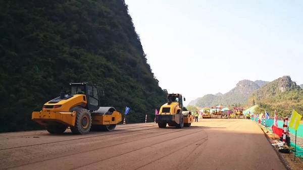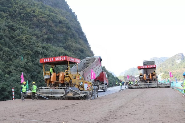 12月27日,随着一阵喜庆的鞭炮声响,在华邦建投集团承建的桂林至柳城高速公路桂柳五标主线K70+560-K71+580段左幅上,摊铺机、压路机、运输车等机械设备紧张有序的开始工作,垫层混合料在两台摊铺机后缓缓滑出。至此,桂林至柳城高速公路项目在此开启了新篇章——路面工程垫层试验段施工正式开始。