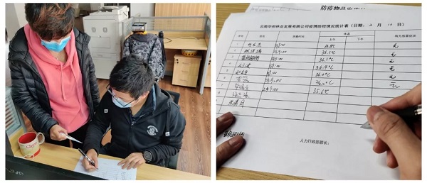 ▲ 在云南华邦林业公司,复工后,员工认真填写疫情防控情况登记表