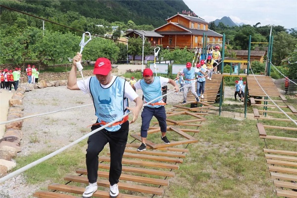 拓展训练项目共设置了“飞夺泸定桥”“突破腊子口”两个大型户外团队协作项目。队伍团结协作、攻坚克难,磨练了全员意志,增进了彼此间的信任和团队凝聚力,攻克了看似“不可能”完成的环节,分享了成功的喜悦和挑战的激情。