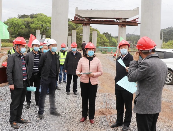 ▲ 今年3月,赵奇玲(中)调研洲塘大桥指导复工复产