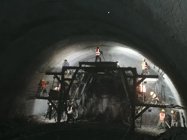 ▲ 部分参建人员挥舞旗帜 共贺永福屯隧道左洞贯通
