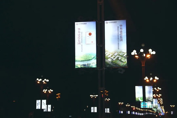 为配合榆中县城市美化“十大提升”行动,榆中房建项目积极响应“美化城市夜景,提高城市品位,提升对外形象”的目标要求,在项目所在地的道路两侧设立路灯广告,助力榆中城区亮化,提升城市形象,增强城市活力,为榆中城区亮化、兰州市创卫积极贡献力量,使得榆中县城城市形象焕然一新,也成为华邦建投宣传企业品牌的重要窗口。