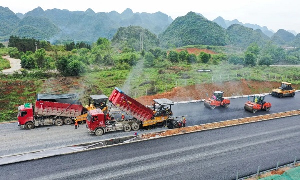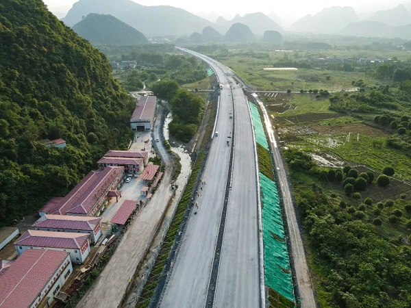 在桂柳项目,各单位统筹协调推动项目进度,高标准、高质量、高效率完成节点目标。桂柳路面正有序推进电焊接网与刺钢丝网隔离栅、波形梁钢及混凝土护栏的安装工作;路面施工进入沥青上、中面层摊铺,透层洒水阶段。桂柳三标鹅颈大桥高填方作业中,路基施工有序进行。桂柳四标古毫隧道进口左线上导开挖作业,古毫1号大桥左线梁板安装完成,其他隧道、桥涵、路基等施工有序推进中。桂柳五标永福屯隧道右幅贯通,大平大桥桥面铺装中,三睦隧道进口高位水池钢筋成功验收。