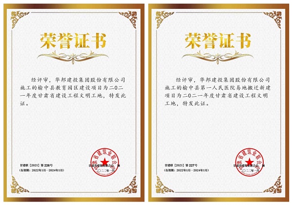 近日,从甘肃省建筑业联合会传来喜讯,经相关专家组评审,由华邦建投集团以EPC模式承建的榆中县教育园区建设项目、榆中县第一人民医院易地搬迁新建项目(以下简称:榆中房建项目)双双荣获2021年度“甘肃省建设工程文明工地”称号,此次获评是对榆中房建项目安全管理、文明施工的肯定,也是对华邦建投建设能力的高度认可。