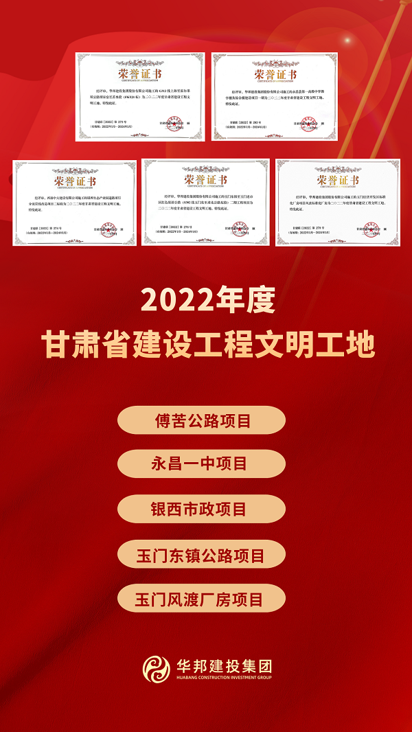近日,在甘肃省建筑业联合会第五届会员代表大会第一次理事会暨总结表彰大会上传来喜讯,由华邦建投集团承建的甘肃傅苦公路项目、永昌一中项目、银西市政项目、玉门东镇公路项目、玉门风渡厂房项目荣获2022年度“甘肃省建设工程文明工地”称号;榆中医院项目荣获2022年度甘肃省工程施工建设项目绿色建造施工水平评价合格项目、甘肃省建筑业BIM+智慧工地示范工程,为公司赢得了良好声誉。