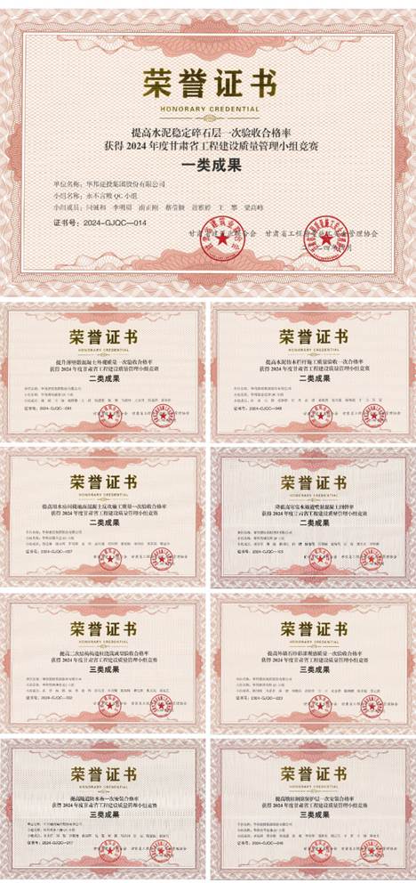 近日,2024年甘肃省工程建设质量管理小组竞赛活动评审结果公布,华邦建投集团推送的QC小组揽获9项QC成果奖,其中一类成果1项、二类成果4项、三类成果4项,涉及房建、市政、公路等多个板块。