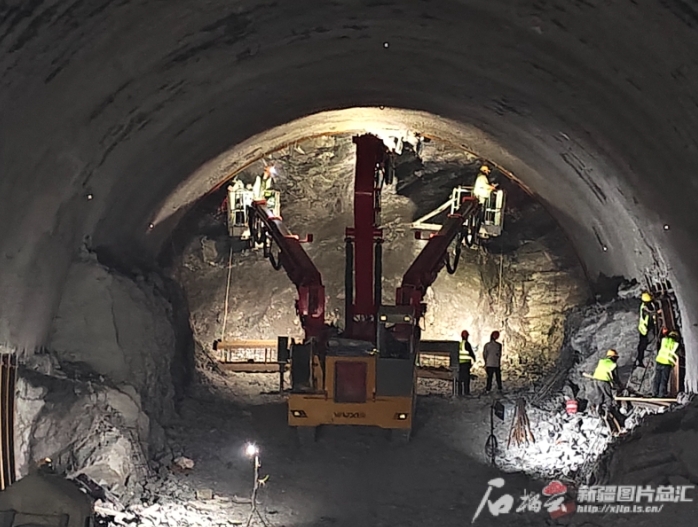 走进天山腹地,国道218线那拉提至巴仑台公路项目艾肯隧道内各种施工机械往来穿梭,轰鸣声不绝。