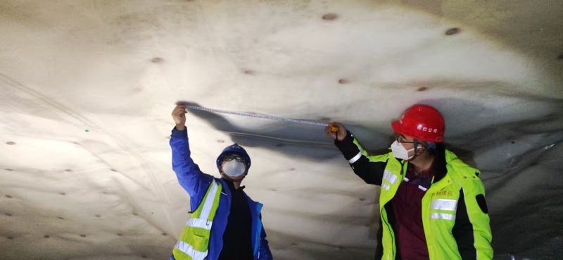 他紧紧跟在3名施工工人身旁,每一块防水板的铺设,他都用卷尺细致丈量,确保接缝焊接面宽度大于1公分,同时仔细检查焊接面是否存在断焊,保证焊接的连续性。这防水板宽3米,环隧道一圈长达24米,意味着每3米就有一道24米长的焊接缝,如此巨大的工作量,需要的不仅是耐心与细致,更考验着他的责任心与担当。