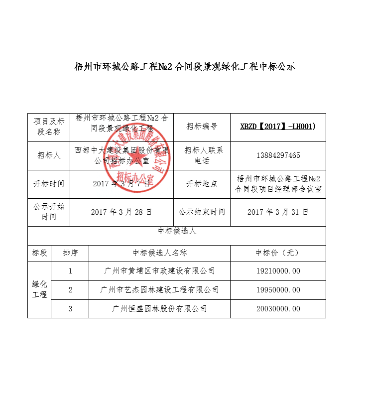 梧州市环城公路工程№2合同段景观绿化工程中标公示